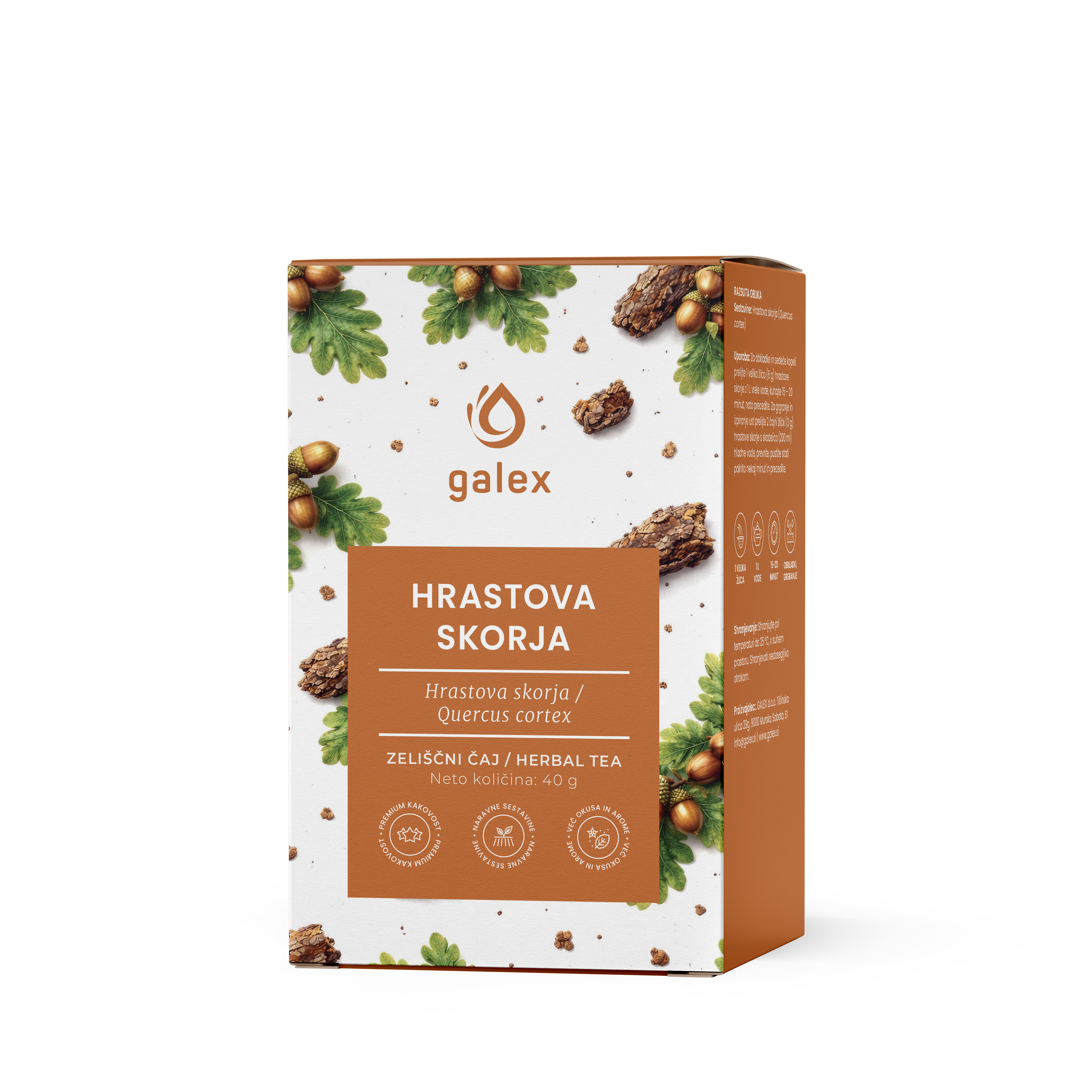 Galex Hrastova skorja je čaj, pripravljen iz posušene hrastove skorje (Quercus cortex), ki je cenjena zaradi svojih številnih zdravilnih lastnosti. Hrastova skorja je znana po visoki vsebnosti čreslovin.